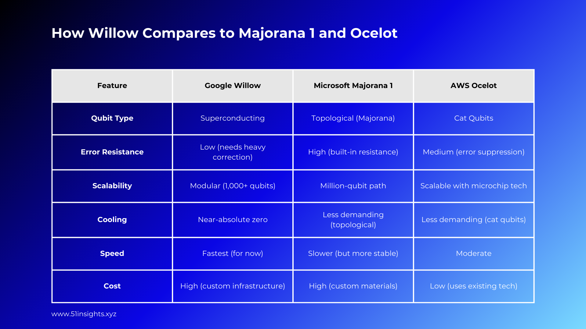 Punchline: The race isn’t about qubit counts—it’s about error-corrected scalability. Microsoft and AWS are betting on new physics (Majoranas/cat qubits) to leapfrog Google’s early lead.