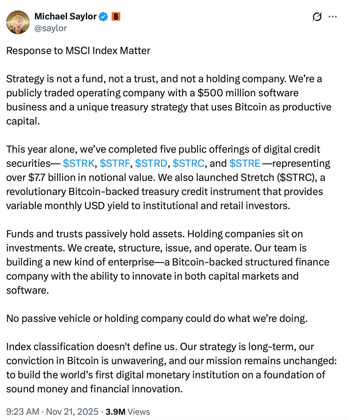 What happened: MSCI released a proposal to purge “Digital Asset Treasury” (DAT) firms from its global indexes. JPMorgan estimates this rule change, potentially effective January 2026, would trigger between $2.8B and $8.8B in forced selling of MicroStrategy (MSTR) as passive funds mechanically dump the stock. See Saylor’s response.