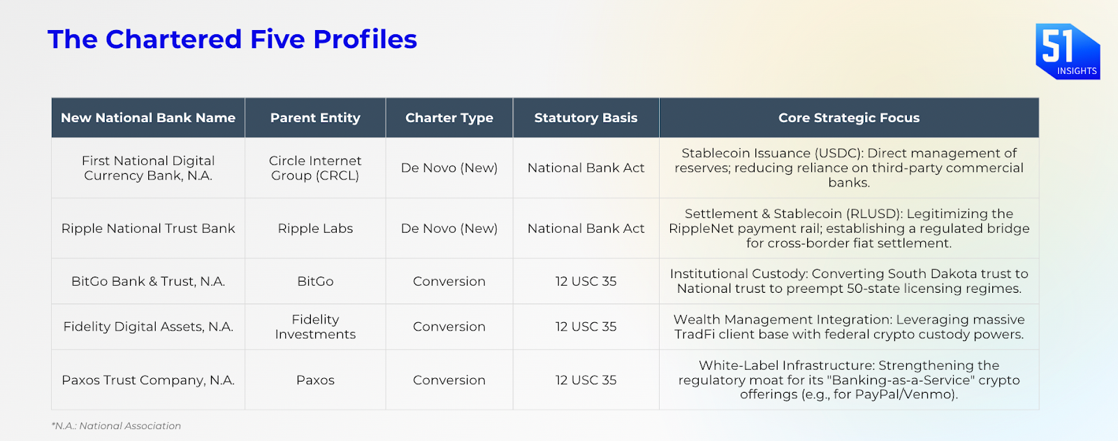 The U.S. banking regulator OCC (Office of the Comptroller of the Currency) approved five crypto-focused firms to operate as national trust banks, pending final conditions. Two are brand new banks (Ripple and Circle), and four: BitGo, Fidelity Digital Assets, and Paxos are upgrading from state to federal oversight. [RELEASE]