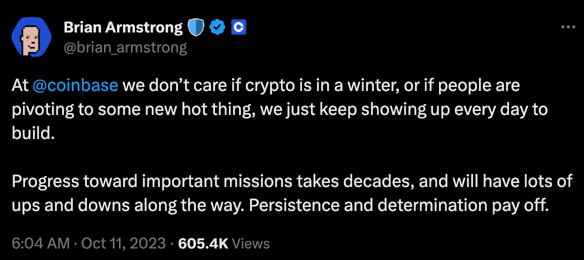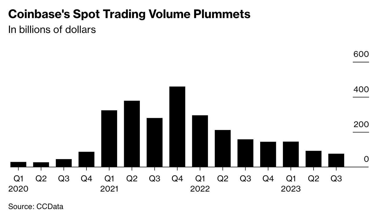 In search of revenue. Regulatory woes in the US and the search for revenue push US crypto companies abroad. This week, CCData reported Coinbase’s quarterly crypto spot trading volume dropping 52% YoY, hitting a low since its 2021 public debut.