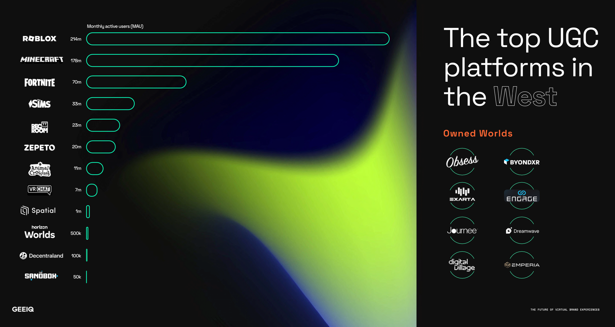 Reality check. Blockchain-based virtual worlds lag in user engagement compared to Roblox's 200m monthly users (vs. Sandbox’s <100k monthly users), with Sandbox’ revenue declining –15% in Q2.