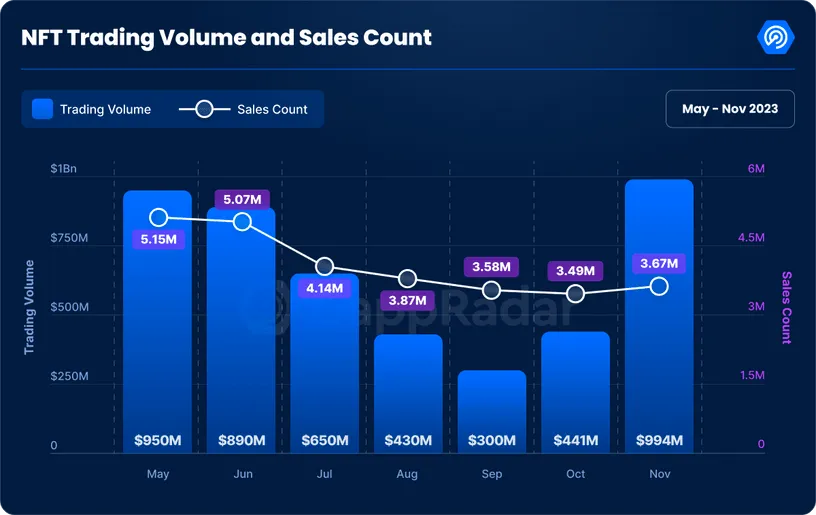 By the numbers: NFT trading volume surged by 125% MoM last month to almost $1bn with top NFT project floors rising to a 7-month high. And the rate of people minting NFTs is increasing. Link