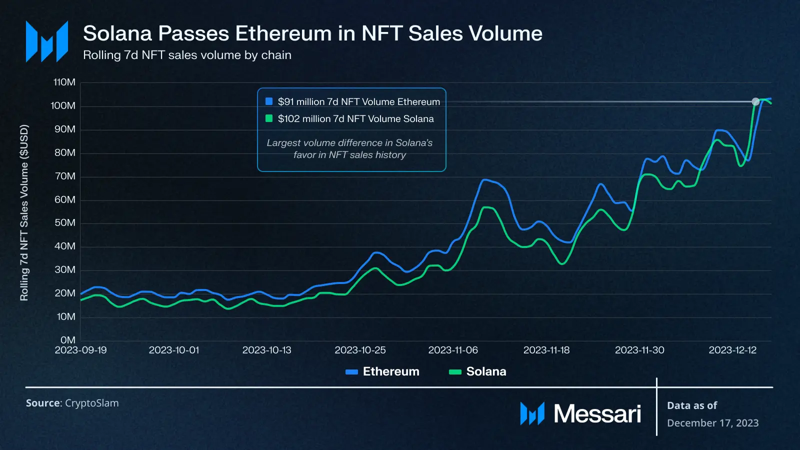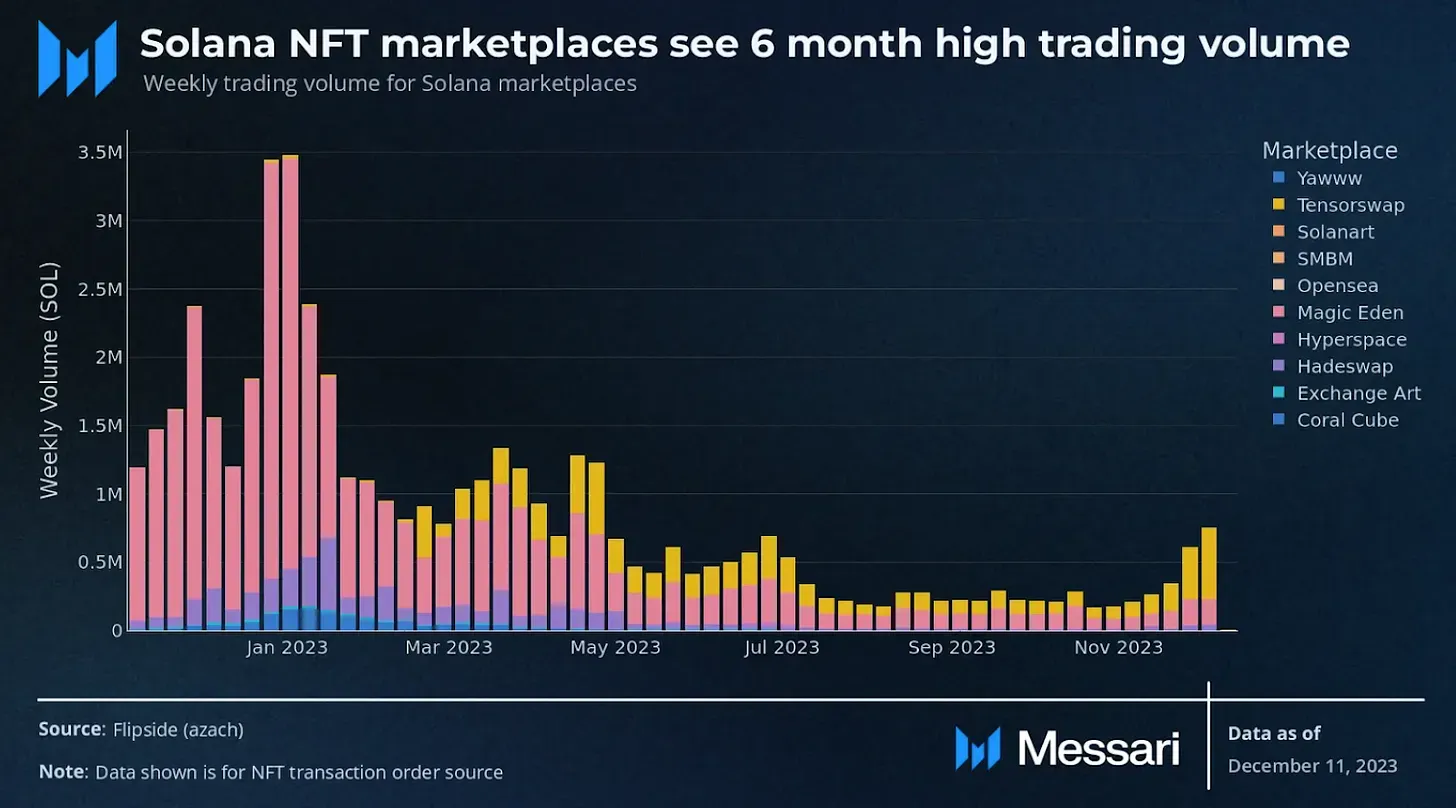 - NFT volumes have surged on Solana, increasing nearly 500% in the last 90 days.