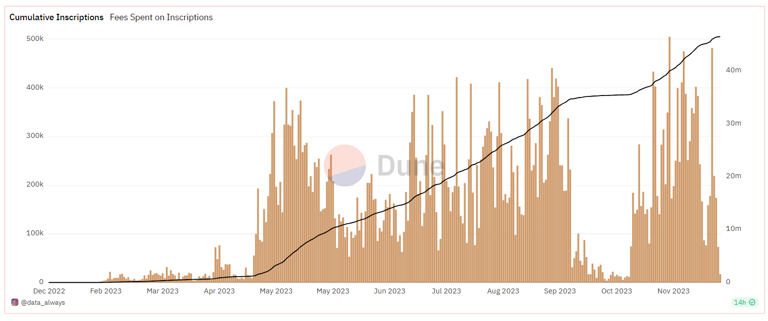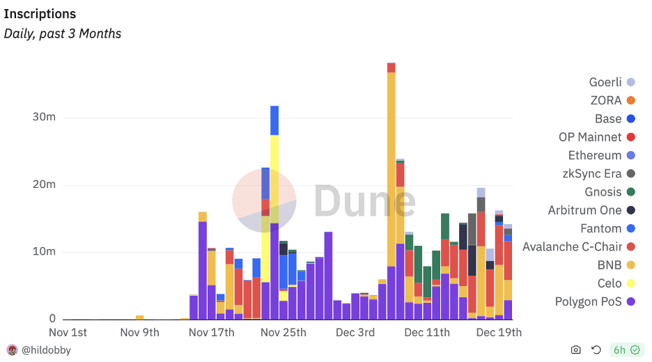 - “Inscriptions” are booming; they’re responsible for over 90% of transactions of many EVM chains this week.