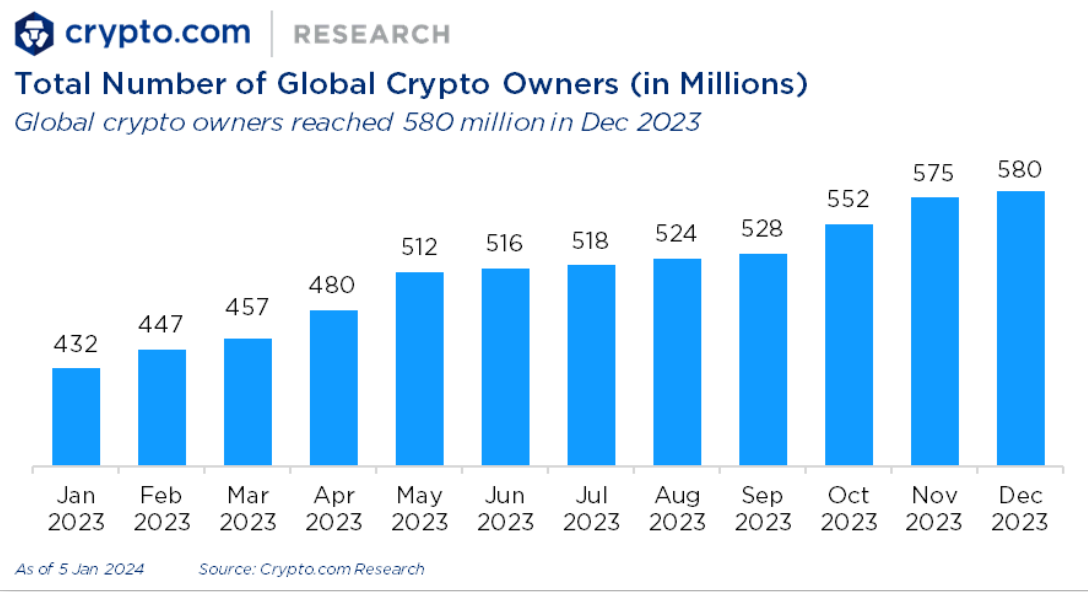 Global crypto user base surged 34% to 580M people in 2023. Link