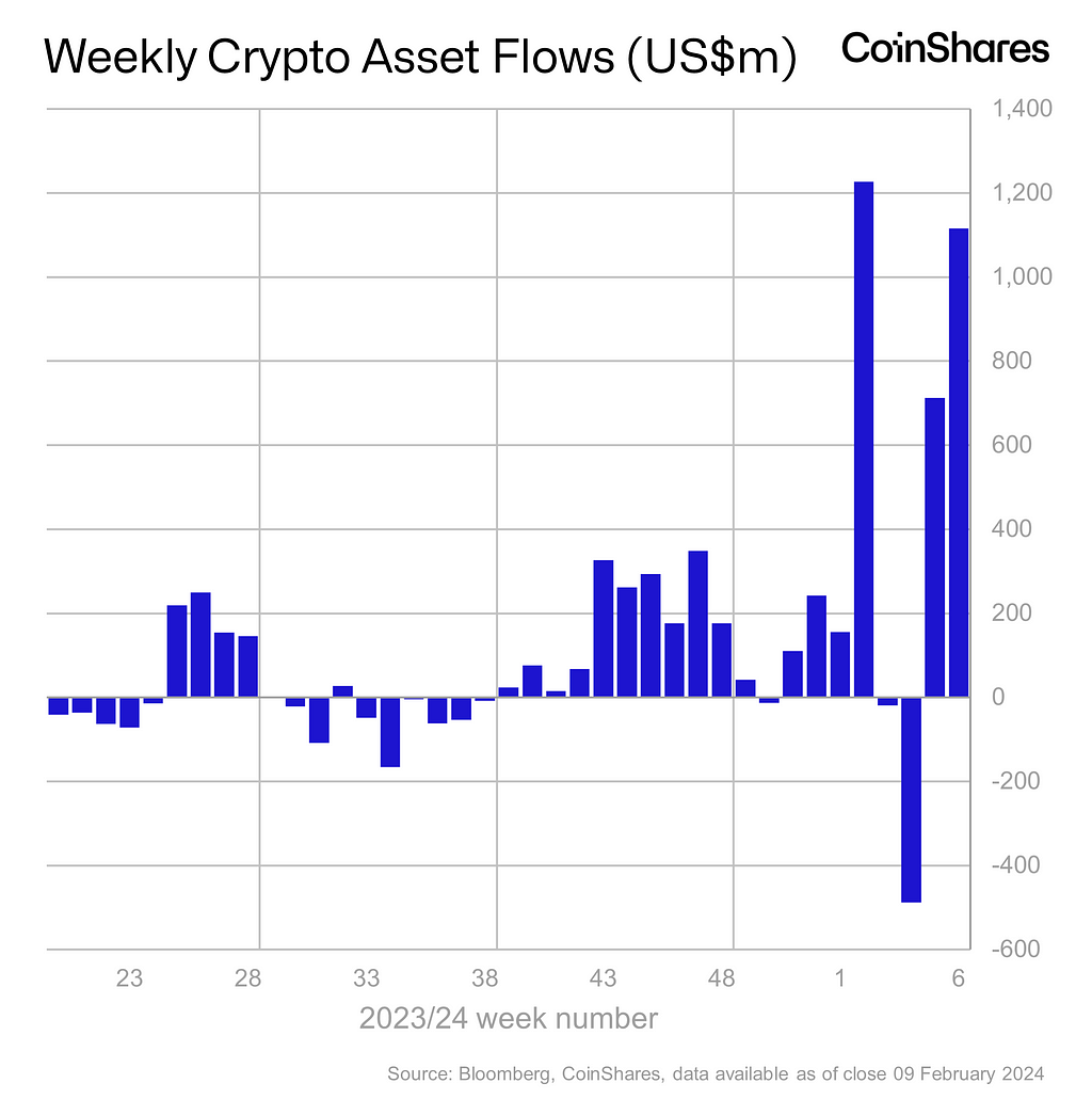 - Digital asset investment products saw inflows of $1.1BN, with year-to-date inflows of $2.7BN. AuM is at the highest level since early 2022 at $59BN.
