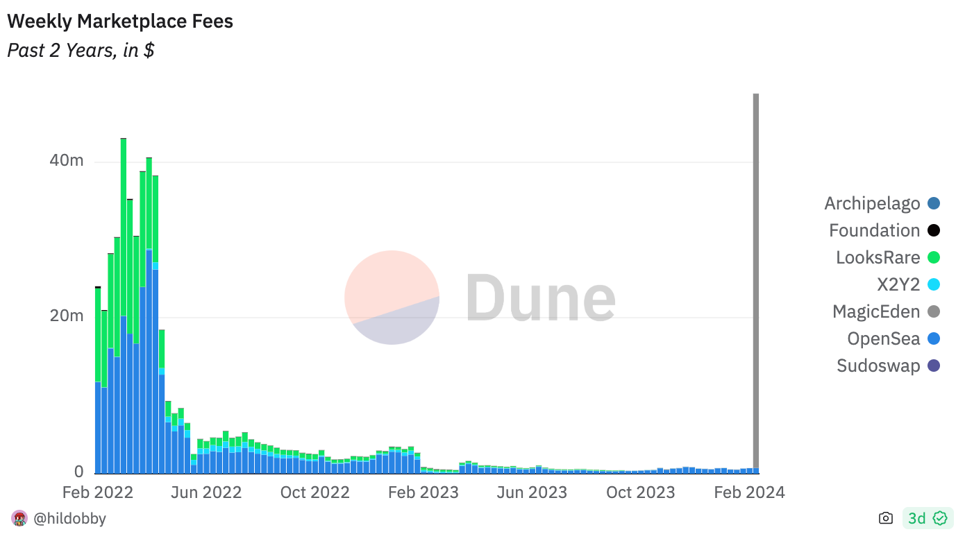 Zoom out: NFTs once promised that artists would earn a share every time their creation was resold, termed "royalty fees". Last August, OpenSea stopped enforcing royalty fees on all new NFTs.