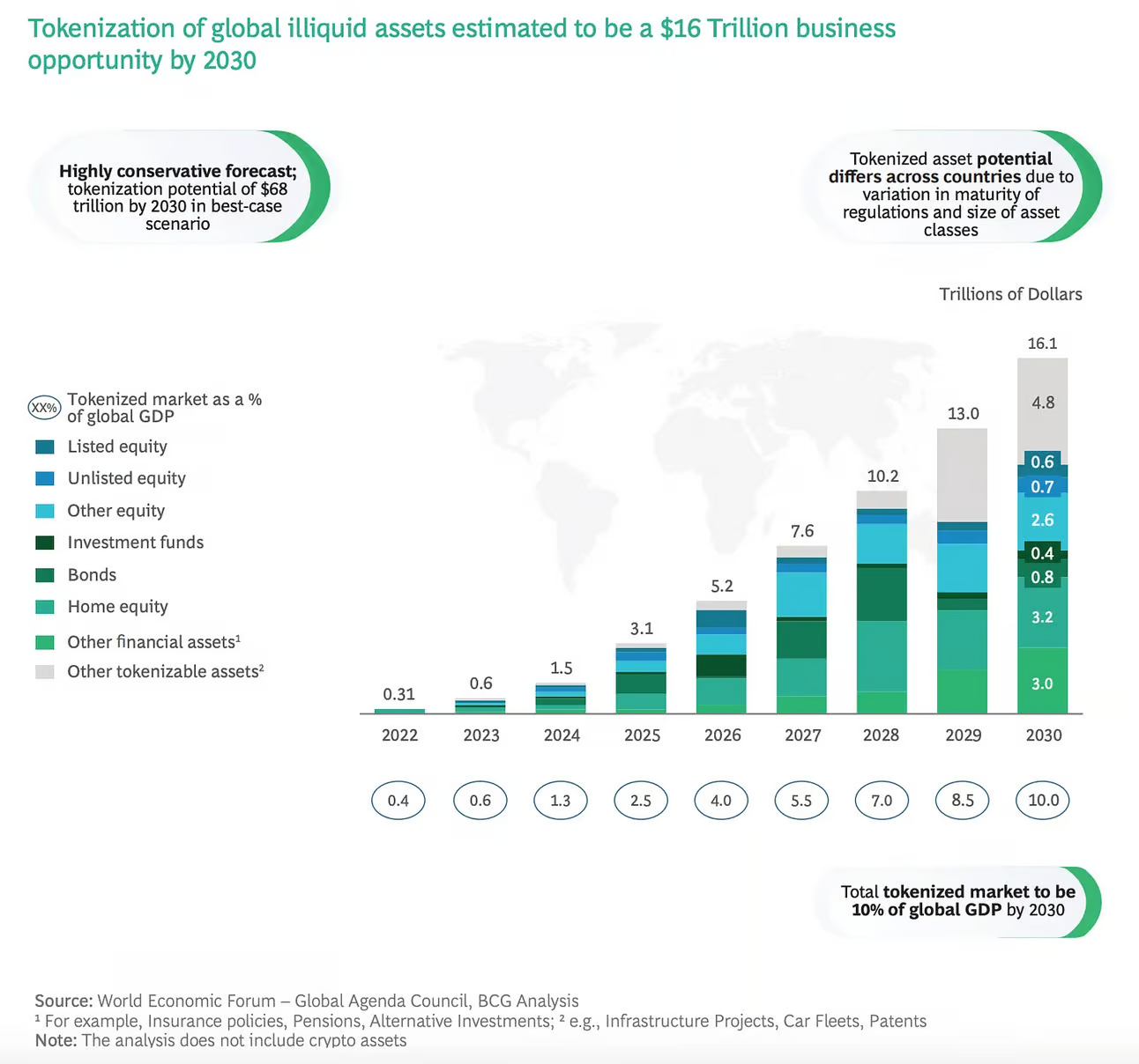 - Boston Consulting Group (BCG) estimated tokenized assets could reach $16 trillion by 2030.
