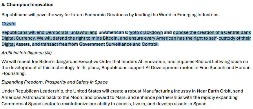 The Republican Party (also called Grand Old Party) released its 2024 GOP Platform, highlighting crypto in Chapter 3: Building the Greatest Economy in the World.