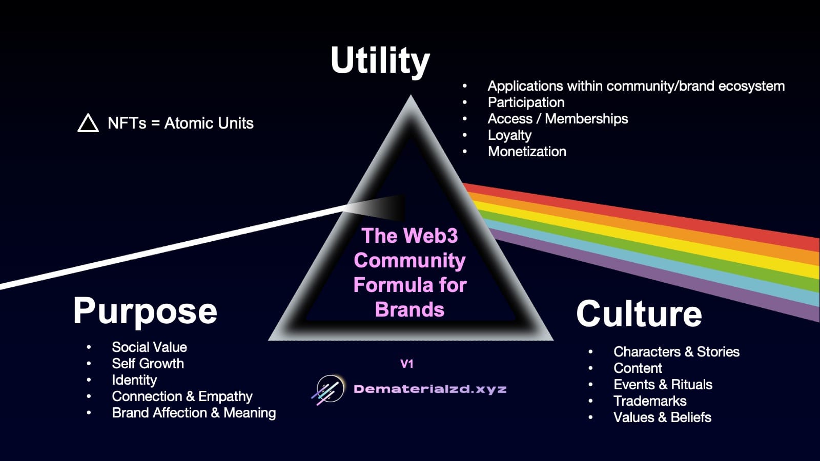 Brands often focus on one dimension instead of all three (utility, purpose, and culture). Many Web3 community projects still lack real utility, purpose or culture. Many don’t do enough to make it feel personal (e.g. by adding physical experiences).