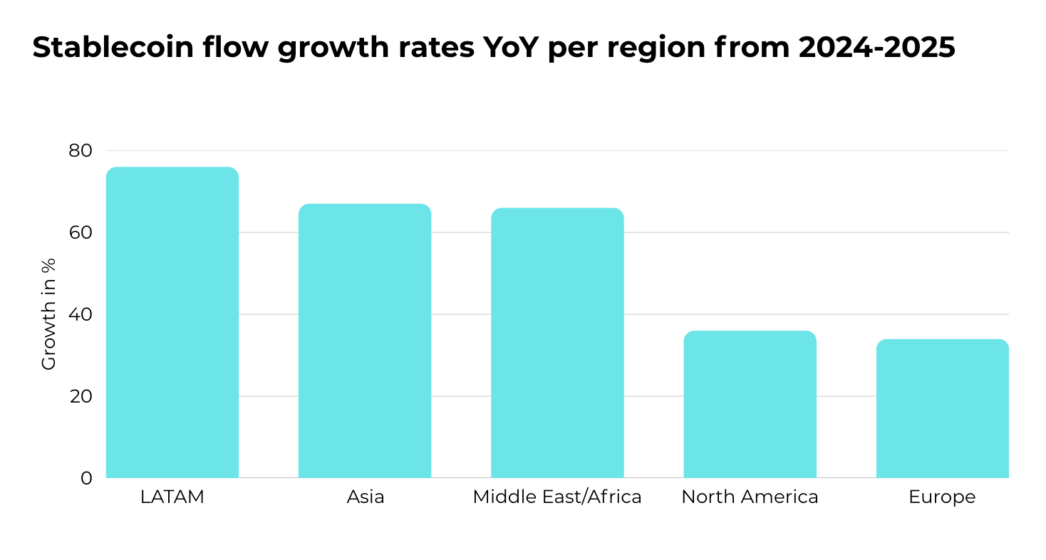 Meanwhile, stablecoin adoption is unequally distributed. While the US captured stablecoin mindshare pioneering regulation and tying stablecoin issuers structurally to U.S. Treasury demand, stablecoin flow growth rates tell another story: