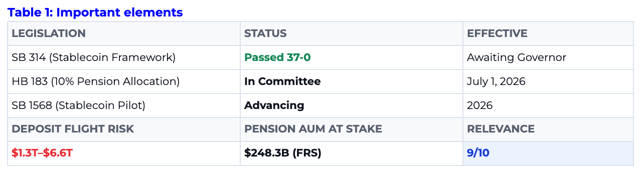 Simultaneously, HB 183 would authorize the Florida State Board of Administration to allocate up to 10% of public funds, including the $225.6 billion FRS Pension Plan, into digital assets: Bitcoin, crypto ETPs, and tokenized securities. And, SB 1568 launches a stablecoin pilot program enabling Floridians to pay state taxes and licensing fees via digital wallets, with instant fiat conversion protecting the General Revenue Fund.