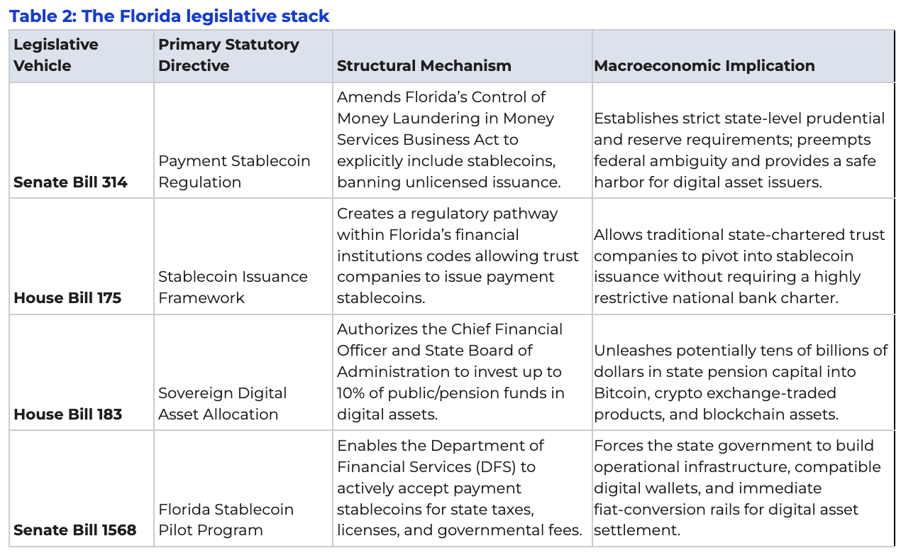 The integrated stack: Florida is not just regulating stablecoins. It is regulating them (SB 314), enabling their issuance (HB 175), capitalizing the ecosystem with sovereign money (HB 183), and building state-government payment rails to accept them (SB 1568). No other state has attempted this level of vertical integration.