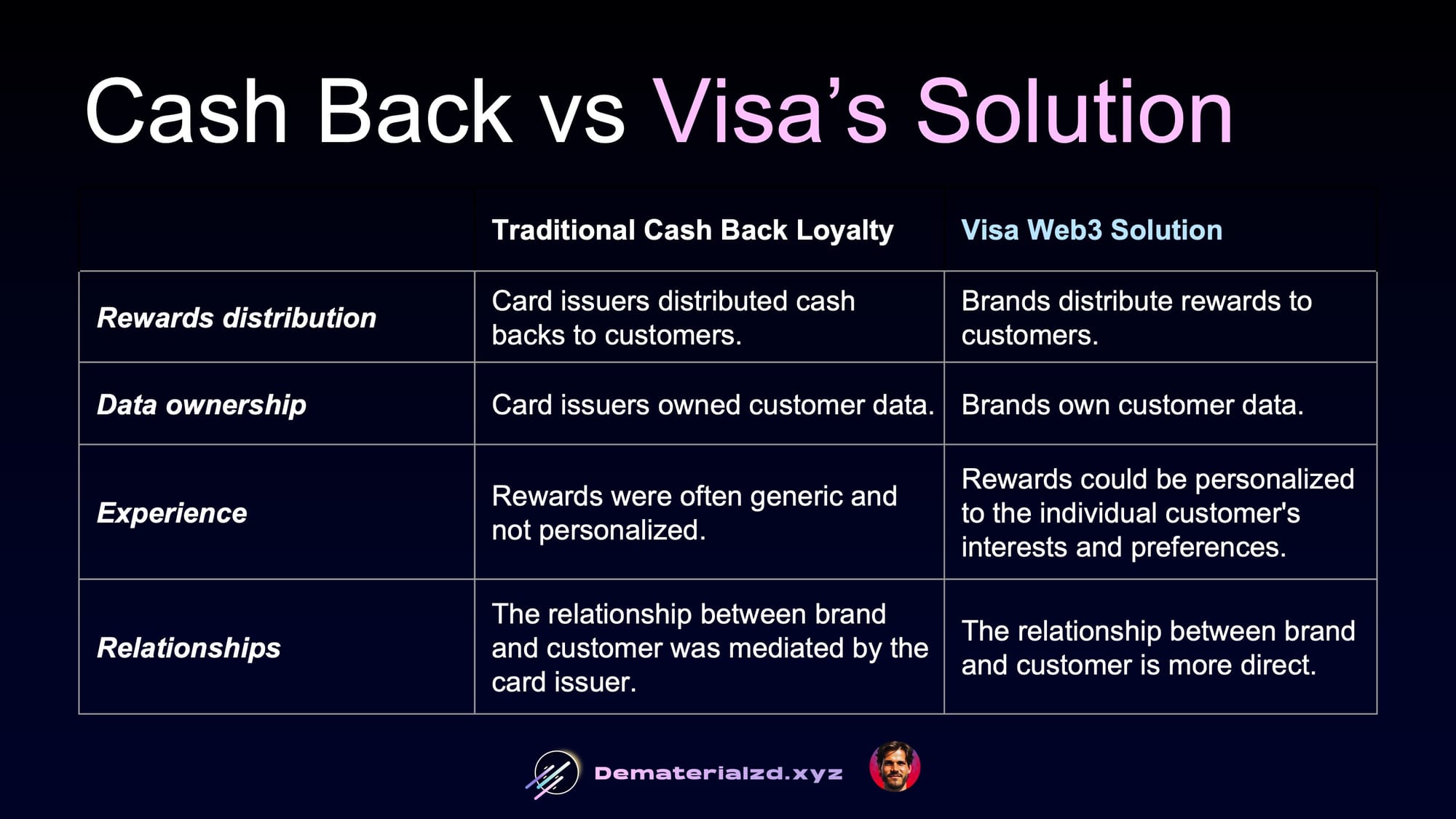 Visa's loyalty solution is designed to enable brands to reward customers directly. This is a shift from the traditional model where cash back rewards were primarily handled by the card issuer and card issuers were the sole intermediaries between brands and customers.