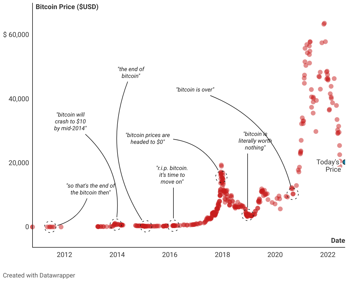 It adds to the famous collection of doomsayers who predicted that “Bitcoin would be dead”. Those doomsayers reappear during Bitcoin downturns, which are by now almost as predictable as the seasons.1 Here’s a great overview of previous sceptics: