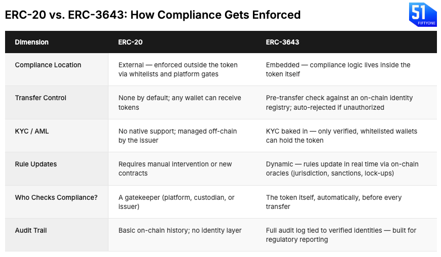 BNP Paribas went further: ERC-3643 embeds compliance inside the token itself, validating every transfer against on-chain identity rules before it executes, no gatekeeper needed. The result is a token that is both publicly settable on Ethereum and institutionally restricted by design.