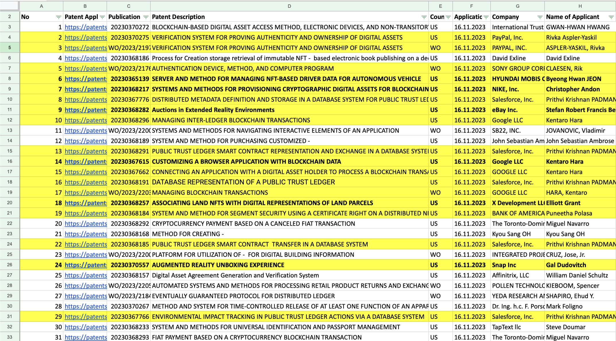 If you want to dig in deeper, you can find detailed data in this Google Sheet. It lists all NFT-related patent applications up to Nov 18, 2023, from the World Intellectual Property Organization.
