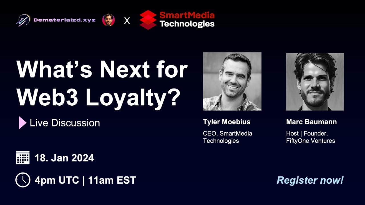 I’ll host a 30min LinkedIn live session on “What’s Next for Web3 Loyalty”, tomorrow at 4pm UTC. Joining me is Tyler Moebius, CEO of SmartMedia Technologies (partner of Dematerialzd). They power Visa’s recently announced Web3 loyalty solution.