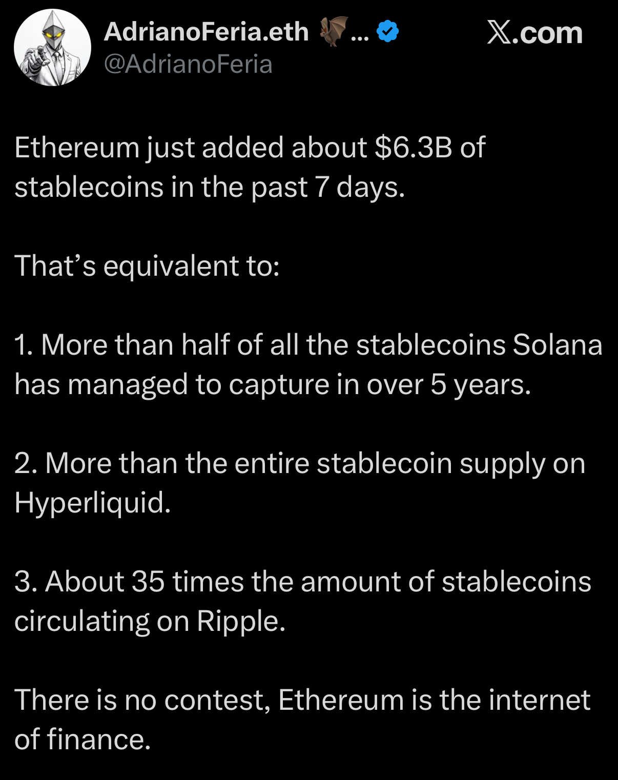 "Corporate chains are AOL in 1995: fast, distribution-heavy, but walled gardens. Ethereum is TCP/IP: messy, neutral, unstoppable. One’s a toll road. The other is becoming a highway system for global finance",