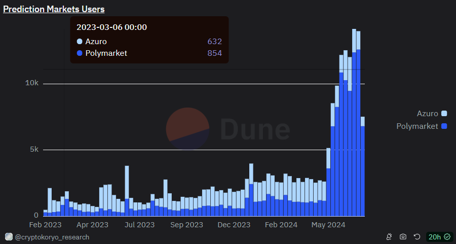 - New wallets visiting Polymarket jumped from 19K to 36K in June with a surge in monthly active traders by 53%.