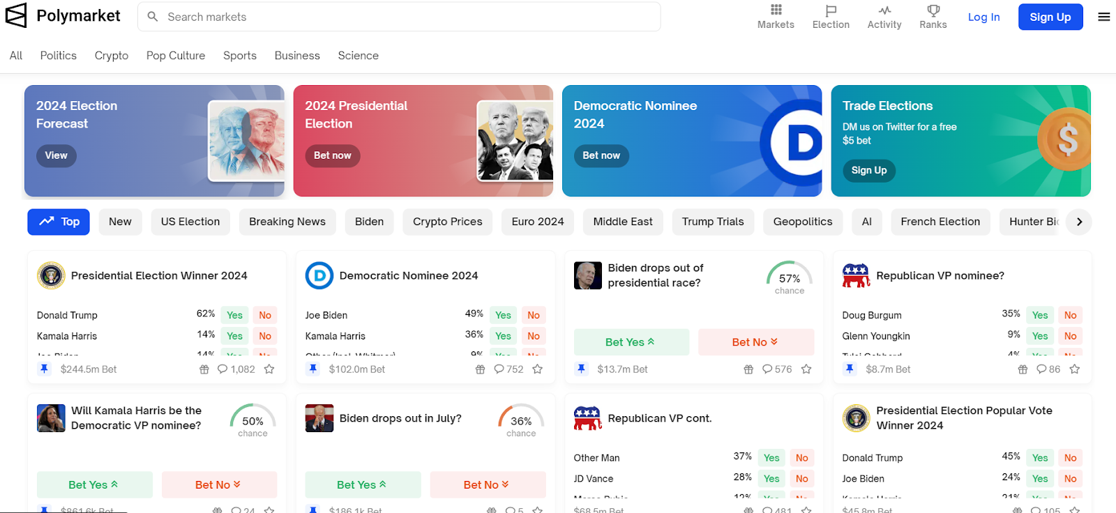 How it works: Polymarket allows users to bet on the future outcomes of a huge range of topics like politics, sports, current events and stocks. This allows it to captures real-time sentiment, engages users and provides an unbiased view of significant events.