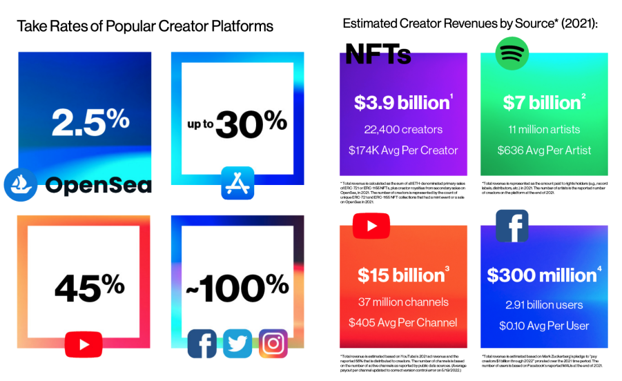 The take-rates of web2 giants are extortionate; web3 platforms offer fairer economic terms. In 2021, primary sales of Ethereum-based NFTs (ERC-721 and ERC-1155), plus the royalties paid to creators from secondary sales on OpenSea, yielded a total of $3.9 billion. That’s quadruple the $1 billion – less than 1% of revenues – that Meta has earmarked for creators through 2022.