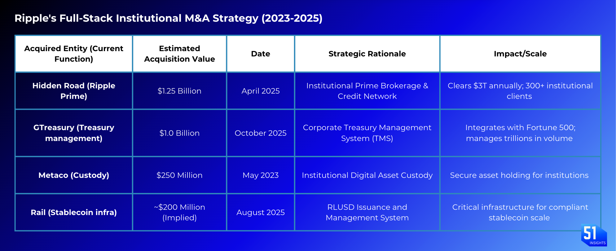 Prime Brokerage: Operating Ripple Prime (aka Hidden Road; acquired in Apr 2025 for $1.25B); handles $3T annually, moves $10B/day, 50M daily transactions