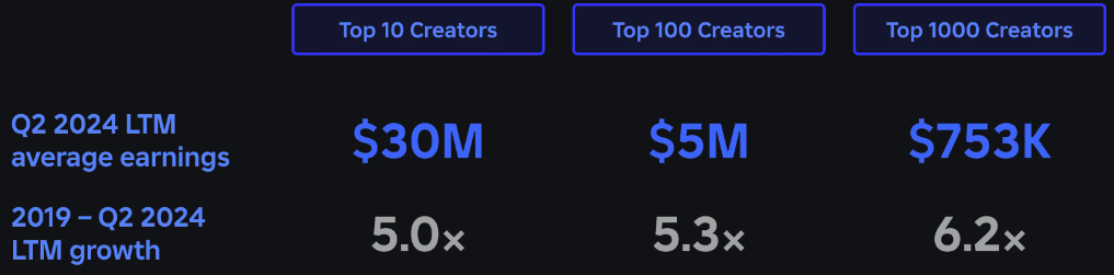 - The top 10 Roblox creators earned an average of $30M in Q2 2024 LTM.