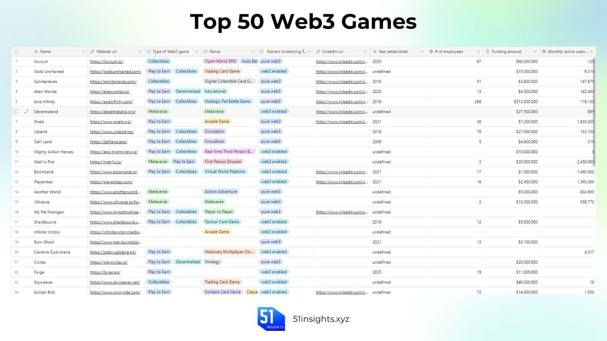 To provide deeper insights, our database includes detailed information on the top 50 Web3 gaming projects. We are continuously expanding the list with added resources. Write to us to gain access to the database.