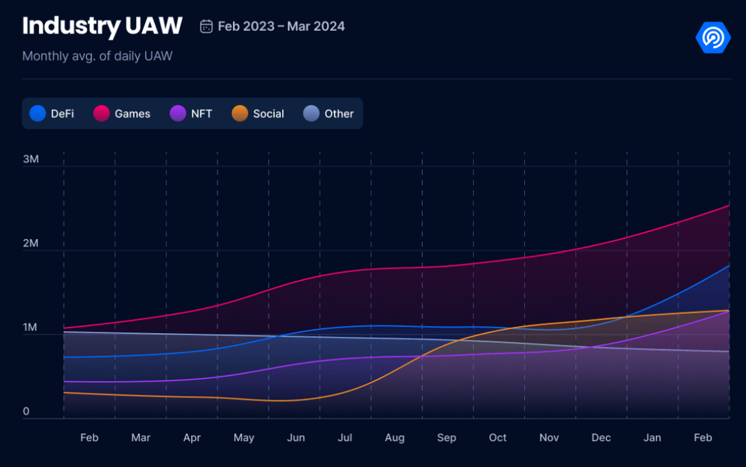 - Blockchain gaming accounts for 30% of the total Unique Active Wallets in the Web3 industry