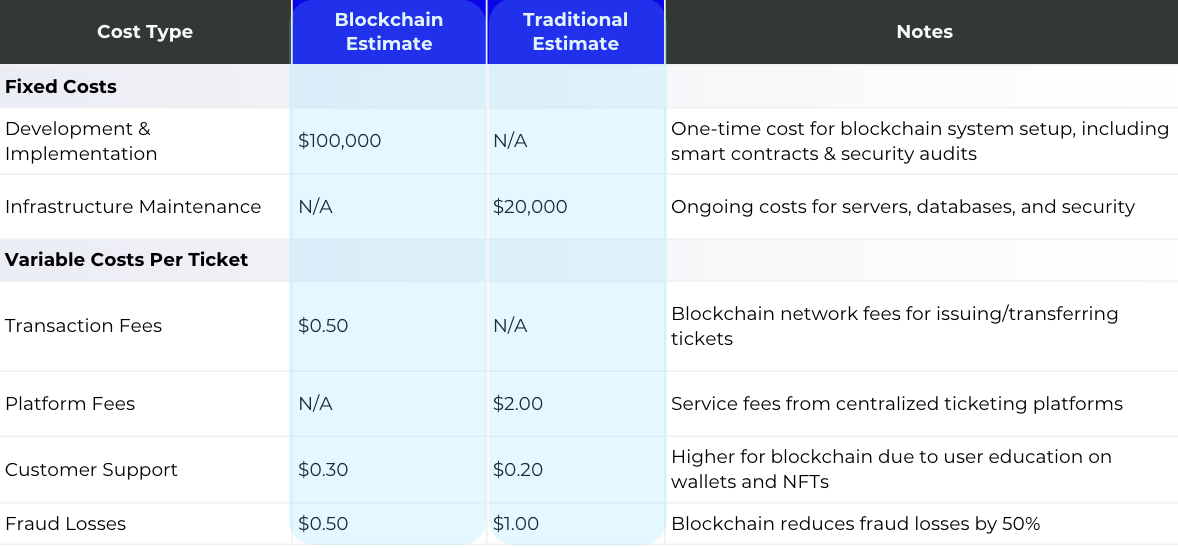 Blockchain ticketing has higher upfront costs but lower per-ticket expenses, making it more cost-effective at scale. While traditional systems charge around $3.20 per ticket, blockchain reduces that to $1.30, reaching break-even at 42,000 tickets sold. With resale royalties that can be enforced on-chain, this drops to 15,000 tickets, making blockchain the more profitable choice for large events and businesses handling multiple sales.
