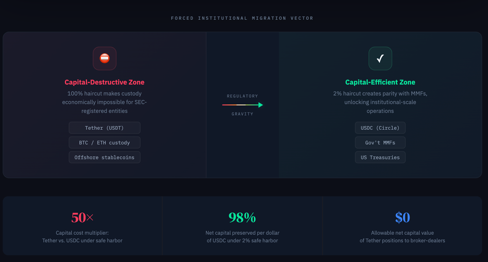 Commissioner Hester Peirce called the old 100% charge “unnecessarily punitive.” The 2% captures residual redemption risk, operational risk, and potential de-peg scenarios, but treats stablecoins as fundamentally low-risk.