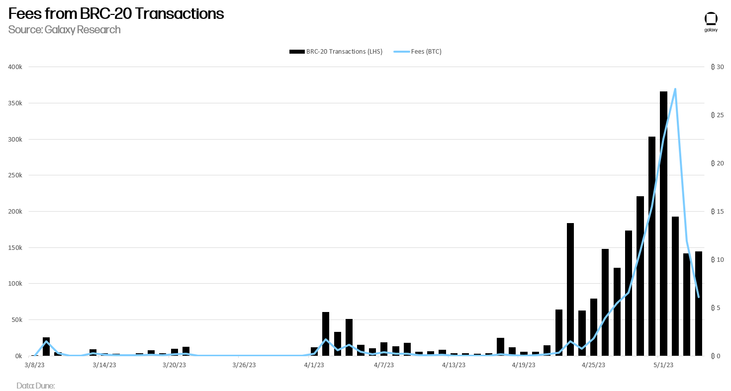 A new token standard for Bitcoin, called BRC-20, is spiking fees to 2021 highs. BRC-20 allows users to inscribe token data to individual sats (the smallest unit of a bitcoin). The emergence of BRC-20s is a notable development for Bitcoin as this is the first-time users can easily create fungible tokens on Bitcoin’s native chain via the ordinals protocol. BRC-20s are also gaining massive support from Bitcoin’s mining community. Miners are generating substantial amounts of new revenue from increased transaction fees. Link