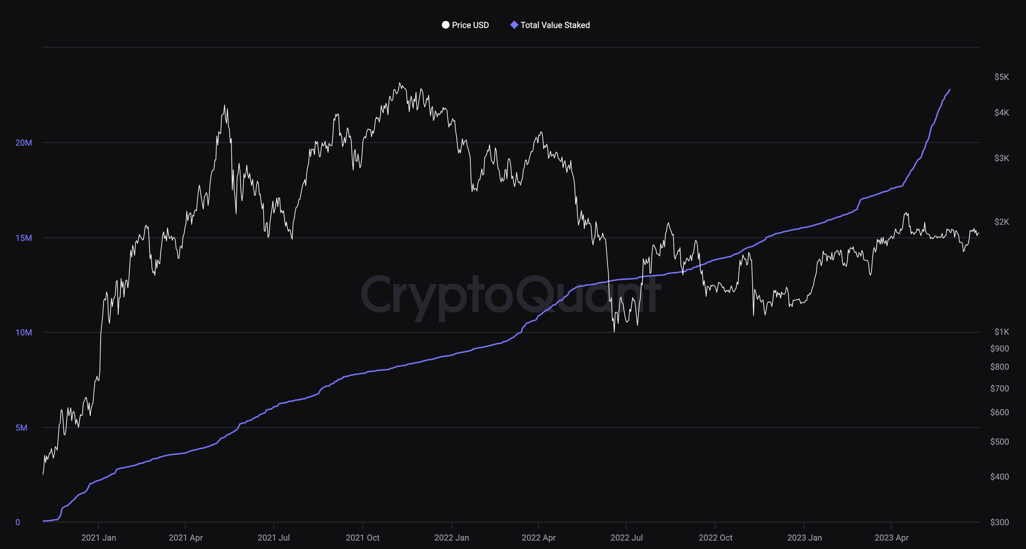 Staked ETH hit the 20m milestone, doubling since the start of year. Staked ETH makes up roughly 16% of the total 120.2 million ETH in circulation. This is still well below the average of around 60% of the top 20 PoS networks.1