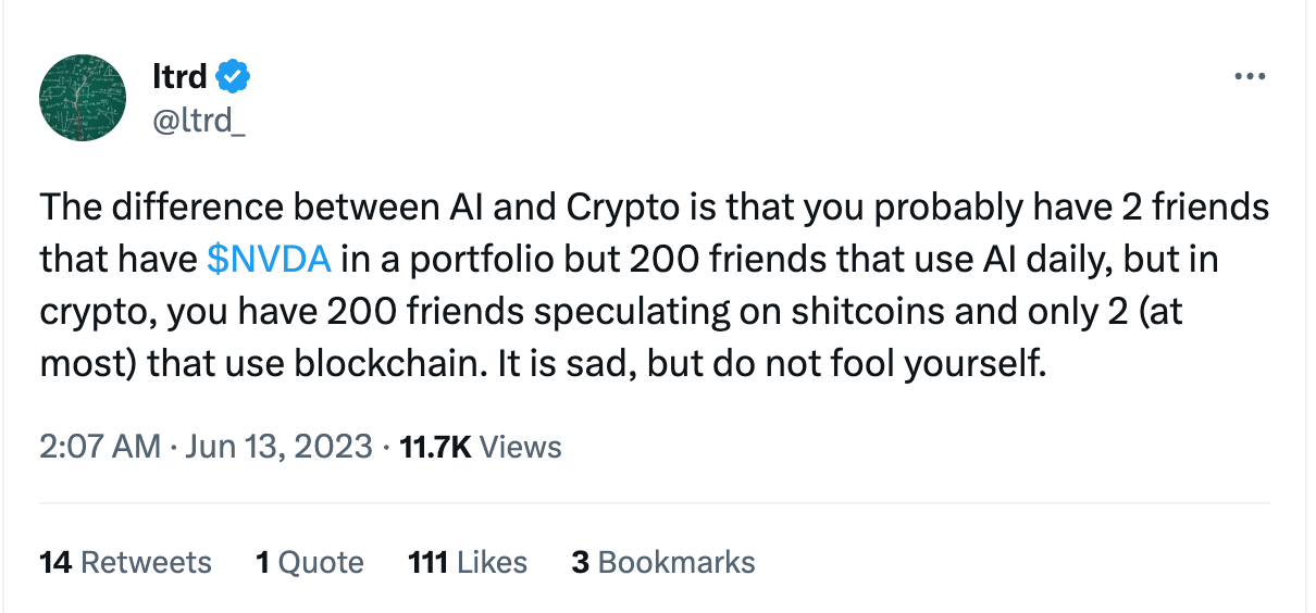 Asset manager Fidelity is preparing to file with the SEC for a spot bitcoin ETF, joining Blackrock, WisdomTree, VanEck, and others.2 This comes amidst a more positive sentiment in the crypto markets, which investors view as a vote of confidence. Link