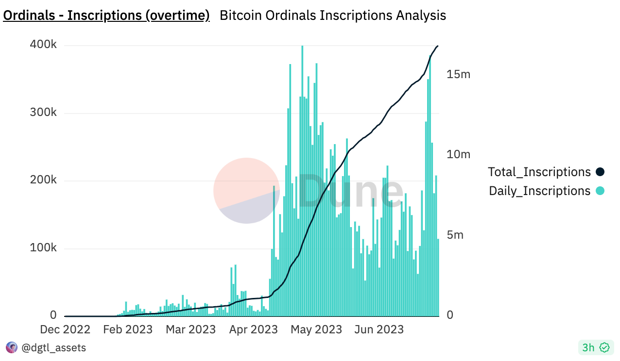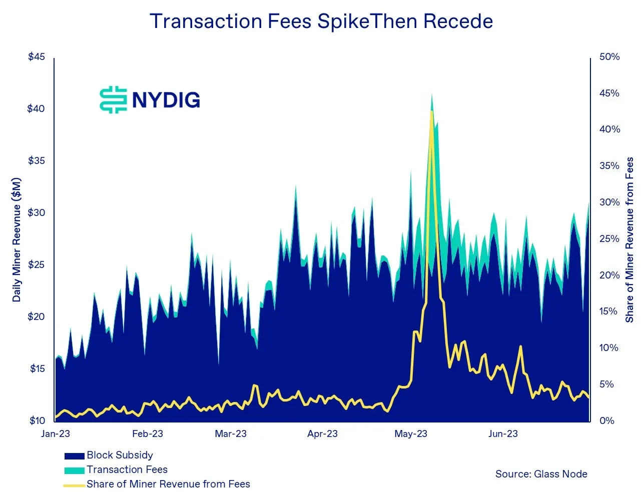 Bitcoin mining revenue1 hit $184 million in Q2 amid Ordinals2 boom, reaching levels previously seen in May 2022. Ordinal inscriptions are still rising, but ordinal fees are going down. Apparently, most inscriptions are text based, which cost less than image based inscriptions.