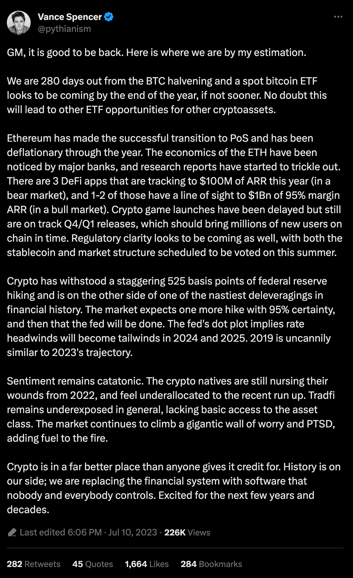 A federal judge ruled that the Ripple Labs Inc. token is a security when sold to institutional investors but not the general public. The Ripple case has been a key legal case of the last few years and could set a precedent for future crypto regulation. It undermines the SEC’s implicit notion that most cryptocurrencies except Bitcoin are securities. And it decimates the SEC’s case against Coinbase. The markets reacted immediately. This is monumental.