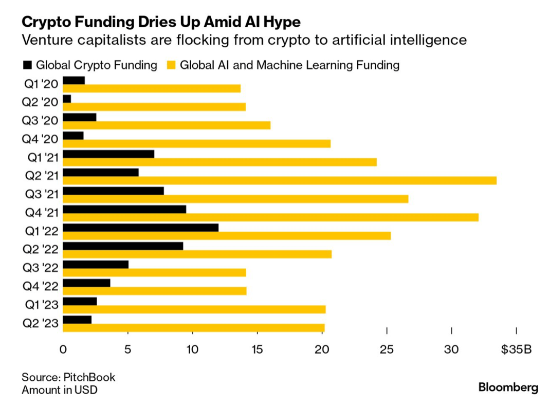 VC funding for crypto startups fell again in Q2, down 71% from the same period in 2022 and reaching its lowest level since the Q4 2020. Crypto funding is losing steam more quickly than the rest of the venture industry. Some of the investors are also pivoting to AI. Link