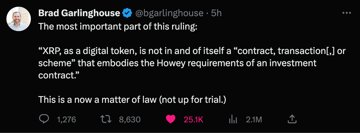 It is encouraging to see more and more established, reputable institutions opening up towards crypto. The landmark result in the Ripple case will add to the positive momentum. This decision affirms so much of what this industry is fighting for.