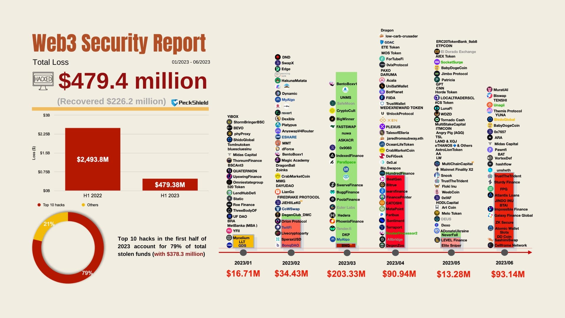Major hacks: In H1 2023, there are 395+ major hacks (386 DeFi-related) in Web3 space, leading to ~$479.4m loss. Among these hacks, top 10 account for $378.3m (79%) of total stolen funds. Link